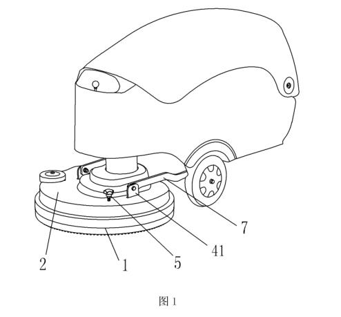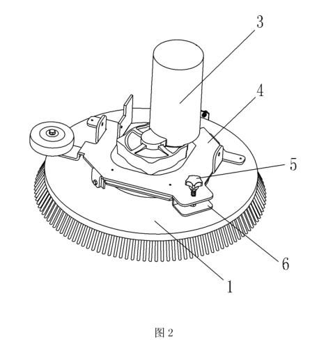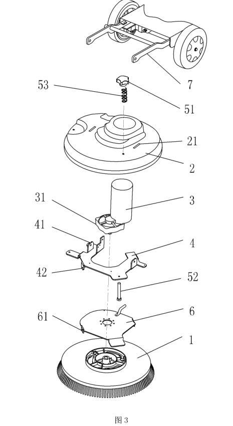 有益效果是:本實(shí)用新型在使用過(guò)程中,當(dāng)調(diào)節(jié)螺栓向下運(yùn)動(dòng)吋,電機(jī)固定板受カ繞鉸接軸轉(zhuǎn)動(dòng),產(chǎn)生偏擺,也帶動(dòng)刷盤(pán)組件向一側(cè)偏擺,從而増大了刷盤(pán)毛單側(cè)對(duì)地面的壓力,進(jìn)而在刷盤(pán)旋轉(zhuǎn)過(guò)程中形成了一定的牽引力,使刷盤(pán)轉(zhuǎn)動(dòng)更加輕松,減輕了操作者的疲勞強(qiáng)度;同時(shí),可根據(jù)地面條件的不同,對(duì)調(diào)節(jié)螺栓的旋入程度進(jìn)行調(diào)整,即調(diào)整對(duì)電機(jī)固定板的壓カ大小,從而改變刷盤(pán)毛單側(cè)對(duì)地面的壓力,以實(shí)現(xiàn)不同地面條件下?tīng)恳Υ笮〉倪m度調(diào)整。